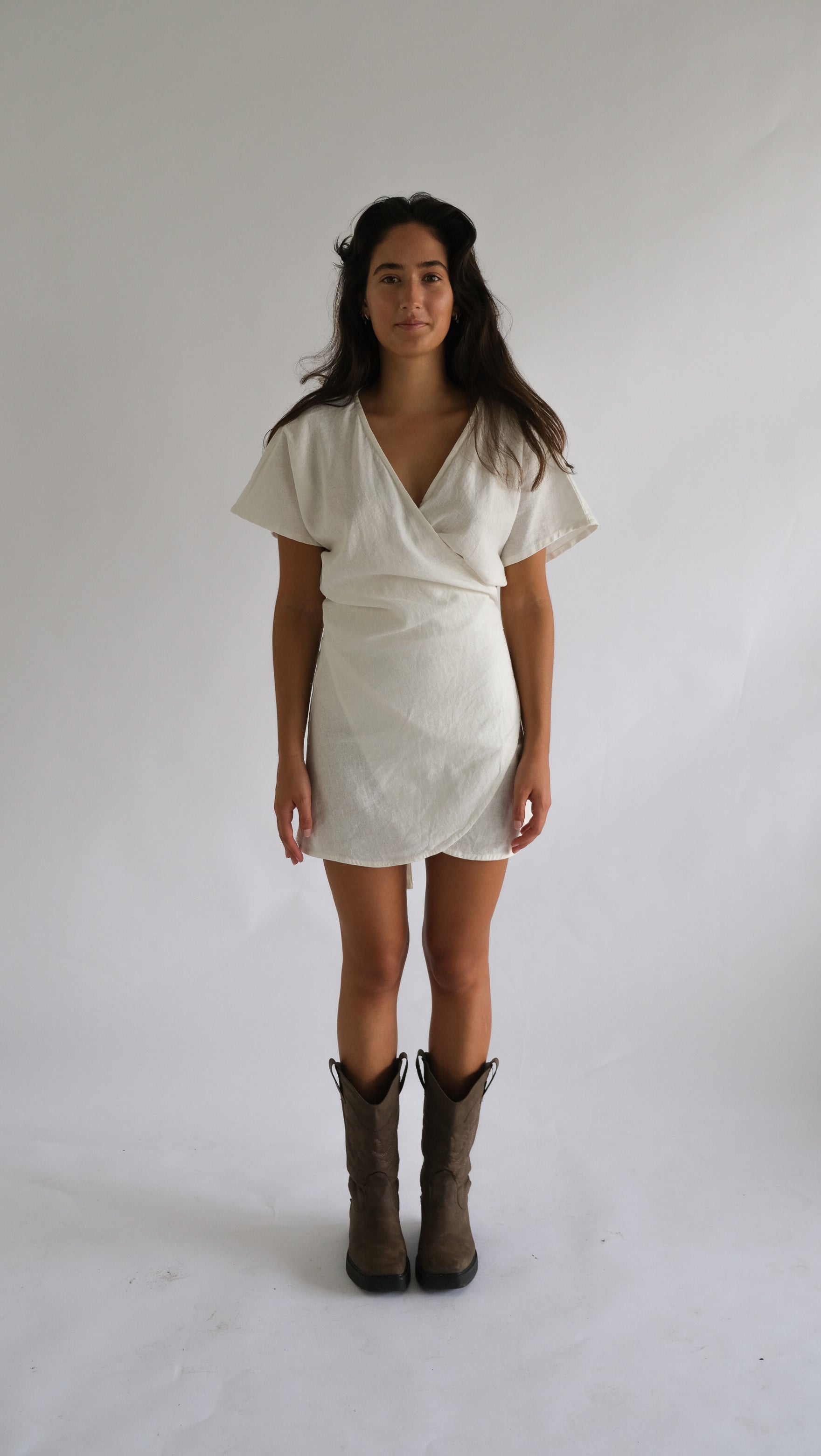 Light and breathable linen blend wrap dress, take Maree down the beach over a bikini or to the bar with some boots.